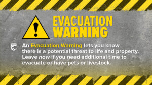 While it’s not a mandatory order, it’s important pay attention and prepare to leave.When a warning is issued, assume an evacuation order could follow. This is your window to get ready: pack a go-bag, gather essential items, and make arrangements, especially if you have pets, large animals, or if you need extra time or assistance to leave. If you or someone in your household may need more time to evacuate safely, don’t wait for an official order. Use the warning as your cue to go early. Those few extra hours or days could save your life.
